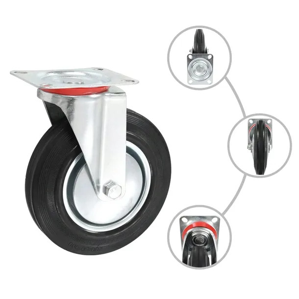 Kółka zostały wykonane z gumy, która wyróżnia się dobrą odpornością na wstrząsy i wibracje, zapewniając płynną i cichą jazdę. Dodatkowo ich miękka powierzchnia skutecznie chroni podłogę przed zarysowaniem. Żelazna, ocynkowana rama jest wysoce odporna na rdzę, co zwiększa wytrzymałość i trwałość kółek. Maksymalna nośność każdego kółka wynosi 180 kg.