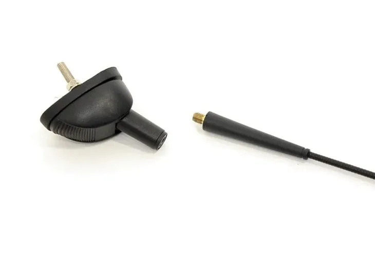 Antena dachowa przeznaczona do odbioru sygnału radiowego w samochodzie, składająca się z pręta śrubowego, gniazda montażowego i kabla zasilającego.