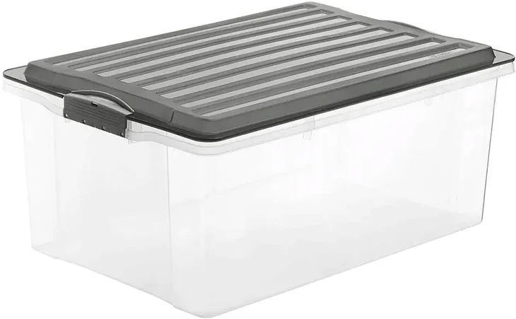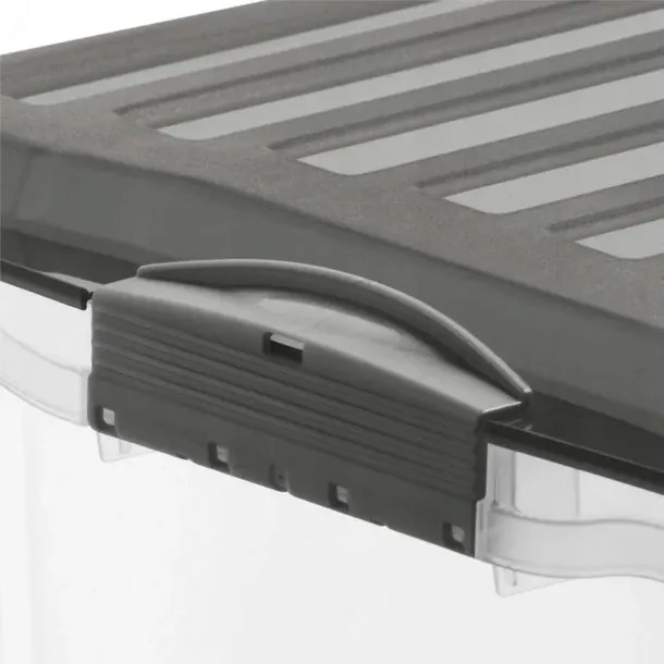 Pudełko do przechowywania o pojemności 38 L. Przezroczyste pudełko + szara pokrywa. Wieko wyposażone jest w klipsy zabezpieczające przed niepożądanym otwarciem. Wysokiej jakości materiał i design.