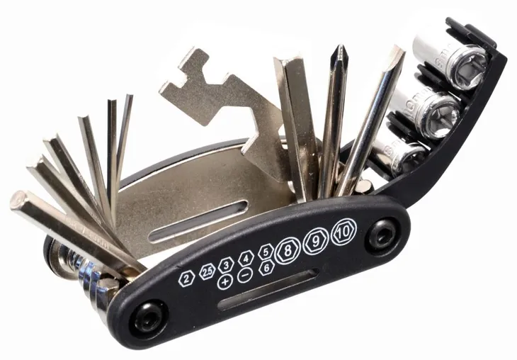 Praktyczny, wielofunkcyjny zestaw narzędzi rowerowych i narzędzi do naprawy dętek w praktycznej, zamykanym futerale.
