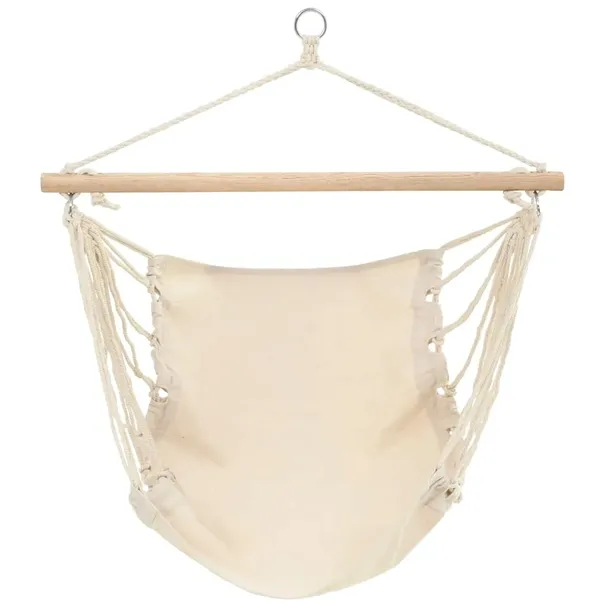 Kremowy hamak wykonany został na kształt wygodnego fotela. Świetnie sprawdzi się jako wygodny mebel ogrodowy. Materiał wykonania to bawełna z domieszką poliestru, oraz drewniana belka do zawieszenia. Dzięki metalowym pierścieniom, możesz bez problemu zawiesić swój wygodny fotel na palu, stojaku czy nawet drzewie. Wygodnie usiądzie w nim jedna osoba, a jego maksymalne obciążenie to 110 kg.