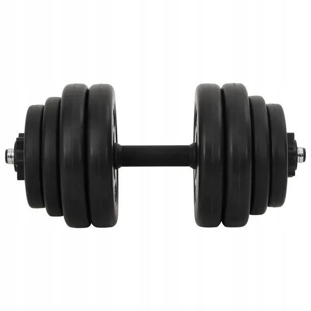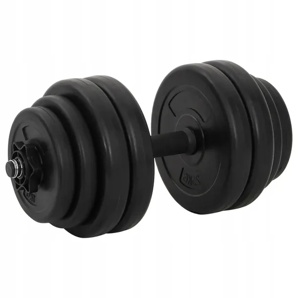 Ten ergonomiczny hantel ma całkowitą wagę 15 kg. Hantle mają antypoślizgowe plastikowe uchwyty, dzięki czemu będziesz mógł ćwiczyć bez obaw, że hantle wyślizgną się z rąk i spadną. Nakładki są wyposażone w śruby gwiazdowe, które zapewniają, że ciężarki są zawsze solidnie zamocowane na drążku. Drążek hantla wykonany jest z mocnego metalu. Powierzchnia chwytu wynosi ok. 14,5 cm. Obciążniki są pokryte wytrzymałym, bezpiecznym dla podłogi plastikiem, dzięki czemu nie słychać irytujących dźwięków stukania ciężarów.
