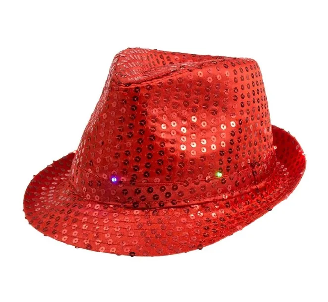 KAPELUSZ ŚWIECĄCY CZERWONY Długość: 28,5 cm Szerokość: 24 cm Średnica: 16 cm Wysokość: 11 cm Kolor: czerwony. Kapelusz w całości obszyty jest cekinami w kolorze czerwonym. Posiada diody świecące w trzech kolorach jednocześnie. Kolory diód: zielony, niebieski, czerwony. W środku kapelusza znajduje się przycisk uruchamiający diody oraz zmieniający częstotliwość ich świecenia. W zestawie znajdują się baterie.