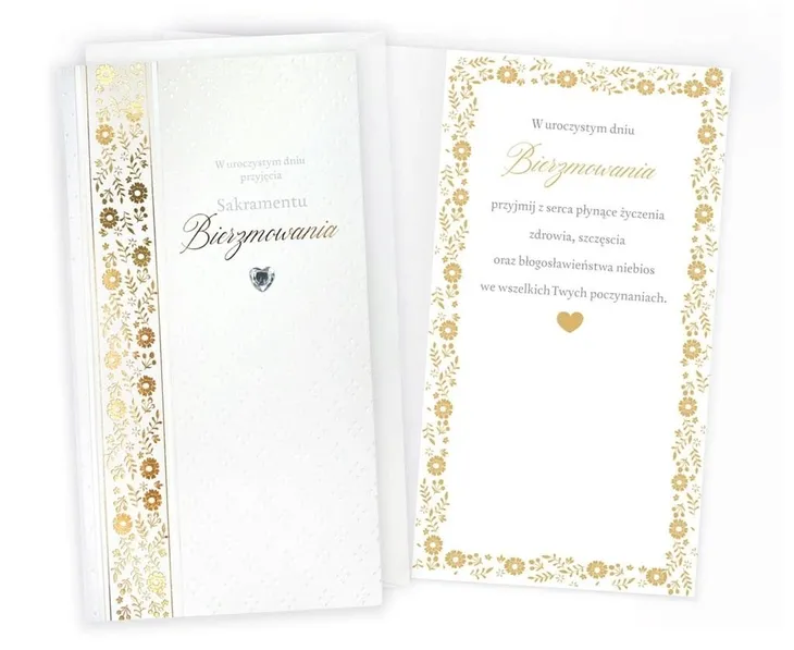 Każda kartka w kolekcji Passion Moments to małe arcydzieło - wyjątkowe i niepowtarzalne, piękne wizualnie. Kartki PM są bardzo bogato zdobione, a jednocześnie skromne i stylowe, cały efekt tkwi w detalach i doskonałym wykonaniu. W zależności od wzoru, na kartkach znajdują się dekoracje ze złotej, srebrnej, perłowej lub holograficznej folii, a także doklejki biżuteryjne, kokardki, brokat, laserowe wycięcia, wstążeczki i inne dodatki. Wnętrze karnetu to zawsze atrakcyjna grafika i tekst życzeń. Kartki mają w komplecie dopasowaną kopertę. Cechy szczególne: zdobienie: przynajmniej dwie folie (metaliczne/perłowe/holograficzne), brokat, elementy doklejane, wycięcia laserowe, wstążeczki - w zależności od wzoru, wnętrze: z delikatną grafiką, wyjątkowe życzenia w środku, w komplecie: dopasowana kolorystycznie koperta, okazja: bierzmowanie Wymiary karnetu po złożeniu: 11,4 x 21,5 cm.