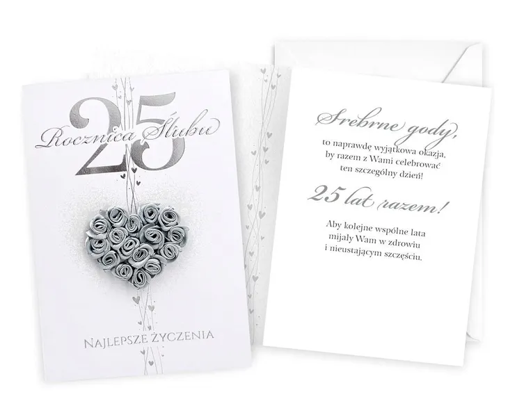Kartka Dream Cards 25 rocznica ślubu DK-1235 Kartka B6 z ozdobnej serii Dream Cards na urodziny z wymiennymi cyframi - nieduża, ale robi wrażenie dzięki atrakcyjnej kolorystyce i ciekawym zdobieniom. To idealny wybór łączący przyjazną cenę z jakością. Cechy szczególne: wielkość: B6, 16.6 x 11.7 cm po złożeniu, koperta: w zestawie, kolorowa, zdobienia: kolorowe, różnorodne, bogate (w zależności od wzoru: przyklejane dekoracje, elementy biżuteryjne, odstawniki, metaliczne folie, tłoczenia itp.), okazja: Rocznica ślubu