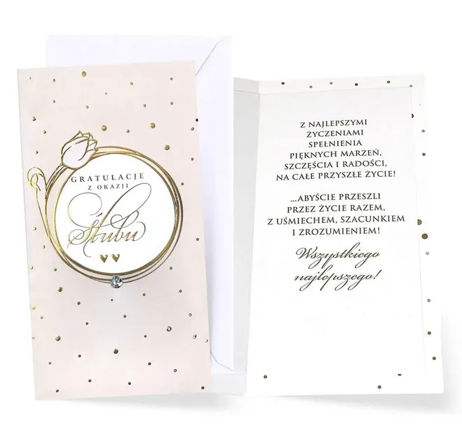 Każda kartka w kolekcji Passion Moments to małe arcydzieło - wyjątkowe i niepowtarzalne, piękne wizualnie. Kartki PM są bardzo bogato zdobione, a jednocześnie skromne i stylowe, cały efekt tkwi w detalach i doskonałym wykonaniu. W zależności od wzoru, na kartkach znajdują się dekoracje ze złotej, srebrnej, perłowej lub holograficznej folii, a także doklejki biżuteryjne, kokardki, brokat, laserowe wycięcia, wstążeczki i inne dodatki. Wnętrze karnetu to zawsze atrakcyjna grafika i tekst życzeń. Kartki mają w komplecie dopasowaną kopertę. Cechy szczególne: zdobienie: przynajmniej dwie folie (metaliczne/perłowe/holograficzne), brokat, elementy doklejane, wycięcia laserowe, wstążeczki - w zależności od wzoru, wnętrze: z delikatną grafiką, wyjątkowe życzenia w środku, w komplecie: dopasowana kolorystycznie koperta, okazja: Ślub Wymiary karnetu po złożeniu: 11,4 x 21,5 cm.