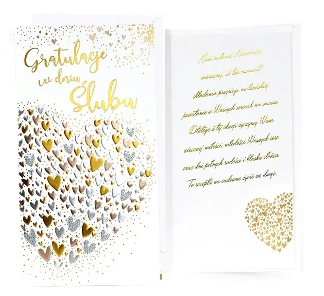 Każda kartka w kolekcji Passion Moments to małe arcydzieło - wyjątkowe i niepowtarzalne, piękne wizualnie. Kartki PM są bardzo bogato zdobione, a jednocześnie skromne i stylowe, cały efekt tkwi w detalach i doskonałym wykonaniu. W zależności od wzoru, na kartkach znajdują się dekoracje ze złotej, srebrnej, perłowej lub holograficznej folii, a także doklejki biżuteryjne, kokardki, brokat, laserowe wycięcia, wstążeczki i inne dodatki. Wnętrze karnetu to zawsze atrakcyjna grafika i tekst życzeń. Kartki mają w komplecie dopasowaną kopertę. Cechy szczególne: zdobienie: przynajmniej dwie folie (metaliczne/perłowe/holograficzne), brokat, elementy doklejane, wycięcia laserowe, wstążeczki - w zależności od wzoru, wnętrze: z delikatną grafiką, wyjątkowe życzenia w środku, w komplecie: dopasowana kolorystycznie koperta, okazja: Ślub Wymiary karnetu po złożeniu: 11,4 x 21,5 cm.