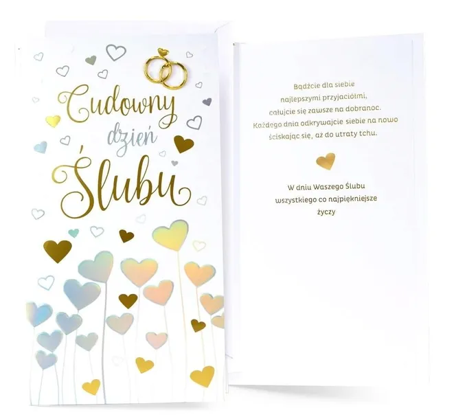 Każda kartka w kolekcji Passion Moments to małe arcydzieło - wyjątkowe i niepowtarzalne, piękne wizualnie. Kartki PM są bardzo bogato zdobione, a jednocześnie skromne i stylowe, cały efekt tkwi w detalach i doskonałym wykonaniu. W zależności od wzoru, na kartkach znajdują się dekoracje ze złotej, srebrnej, perłowej lub holograficznej folii, a także doklejki biżuteryjne, kokardki, brokat, laserowe wycięcia, wstążeczki i inne dodatki. Wnętrze karnetu to zawsze atrakcyjna grafika i tekst życzeń. Kartki mają w komplecie dopasowaną kopertę. Cechy szczególne: zdobienie: przynajmniej dwie folie (metaliczne/perłowe/holograficzne), brokat, elementy doklejane, wycięcia laserowe, wstążeczki - w zależności od wzoru, wnętrze: z delikatną grafiką, wyjątkowe życzenia w środku, w komplecie: dopasowana kolorystycznie koperta, okazja: Ślub Wymiary karnetu po złożeniu: 11,4 x 21,5 cm.