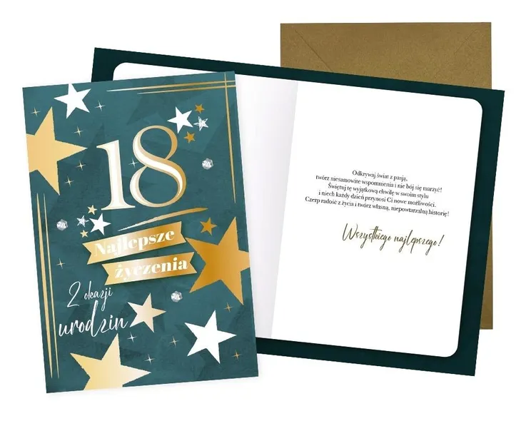 Kartka Dream Cards na Osiemnastkę Najlepsze życzenia DK-1286 Kartka B6 z ozdobnej serii Dream Cards - nieduża, ale robi wrażenie dzięki atrakcyjnej kolorystyce i ciekawym zdobieniom. To idealny wybór łączący przyjazną cenę z jakością. Cechy szczególne: wielkość: B6, 16.6 x 11.7 cm po złożeniu, koperta: w zestawie, kolorowa, zdobienia: kolorowe, różnorodne, bogate (w zależności od wzoru: przyklejane dekoracje, elementy biżuteryjne, odstawniki, metaliczne folie, tłoczenia itp.), okazja: osiemnastka, urodziny