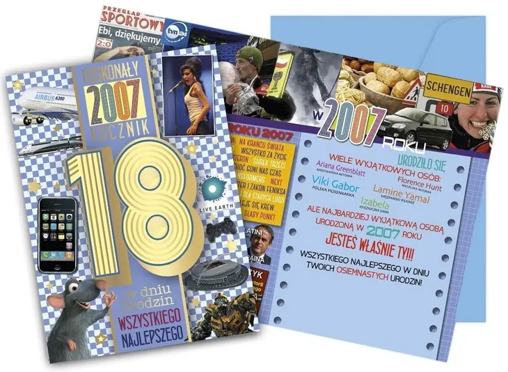 Karnet Vision Urodziny 18 V-115 Kartka z serii To Był Rok, w której w środku i na froncie znajdują się ciekawe wydarzenia z danego roku. Wykonane z niezwykłą dbałością o szczegóły, zdobione folią holograficzną i w całości pokryte folią matową dla podkreślenia efektu prostoty i elegancji. Każdy karnet zawiera w środku starannie dobrane życzenia oraz dopasowaną kopertę. W powiększonym formacie 140x190 mm. Cechy szczegółowe: wnętrze: kolorowe, wyjątkowe życzenia w środku, w komplecie: dopasowana kolorystycznie koperta. wymiary kartki 14 x 19 cm okazja: 18 urodziny.