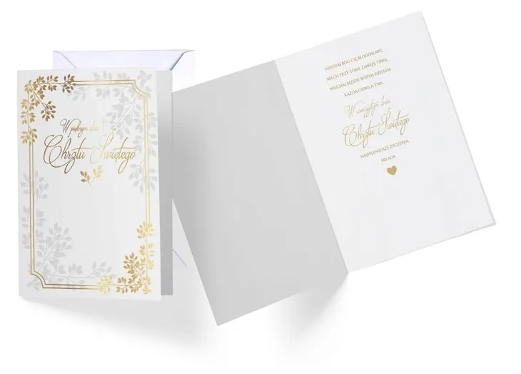 Karnet Vision Chrzest w powiększonym tzw. Angielskim formacie 140x190 mm. Wykonane z niezwykłą dbałością o szczegóły, zdobione folią holograficzną i w całości pokryte folią matową dla podkreślenia efektu prostoty i elegancji. Wewnątrz znajduje się tekst życzeń, a całość uzupełnia dedykowana biała koperta.