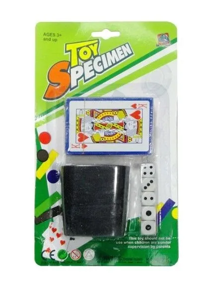 Zestaw do gry karty i kości. Produkt zapakowany w kartonową podstawkę z przezroczystym kloszem. Zestaw przeznaczony dla dzieci od 3 lat.