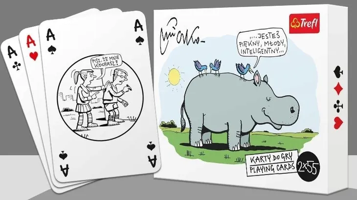 Zestaw dwóch talii kart do gry (pełne, w każdej 52 karty + 3 jokery) z rysunkami o tematyce obyczajowej autorstwa Andrzeja Mleczki