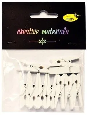 Klamerki drewniane wielkości 35x10 mm, pokryte wodoodporną farbą w kolorze białym. Opakowanie zawiera 10 klamerek. Pakowane w opakowanie z eurozawieszką.
