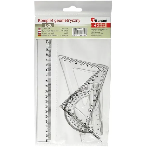 - komplet czteroelementowy - transparentny - zawiera: linijkę 20 cm, 2 ekierki, kątomierz - pakowany w woreczek z zawieszką