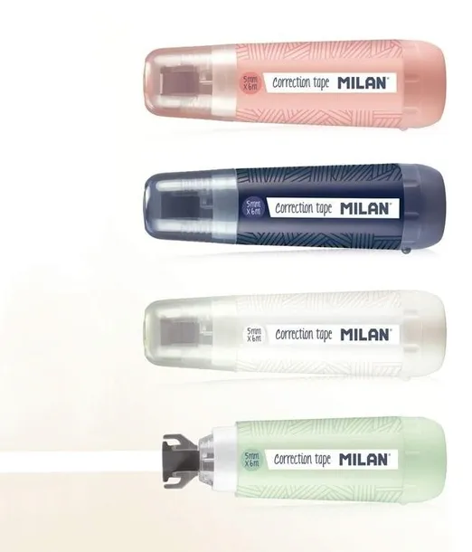 Korektory mini w taśmie nawiązujące kolorystyką do Serii 1918. Cylindryczne,posiadają skuwkę zabezpieczającą. Odpowiednie dla osób leworęcznych dzięki obrotowej końcówce. Rozmiar taśmy: szerokość 5 mm x długość 6 m. Szybki, czysty i dokładny. Korekty na wszystkich rodzajach papieru. Nie pozostawia śladów na kserokopiach. Seria 1918 jest inspirowana oryginalnymi kolorami i wzornictwem gumek MILAN. Rozmiar korektora: 7,7 x ? 2,2 cm.