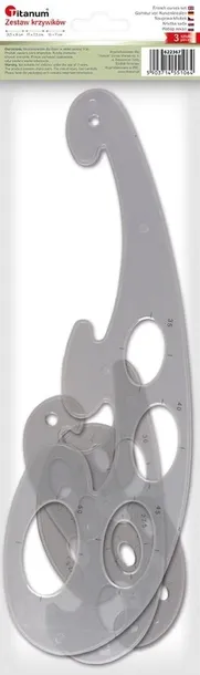 Zestaw solidnych krzywików wykonanych z tworzywa sztucznego. Wszystkie krzywiki posiadają podcięcia do rysunku tuszem oraz wypustki zabezpieczające przed rozmazywaniem rysunku, w skład zestawu wchodzą 3 przydymione krzywiki do krzywizn: parabolicznych, hiperbolicznych, eliptycznych, wymiary: 31,5x9 cm, 17x7,5 cm, 13x7 cm.