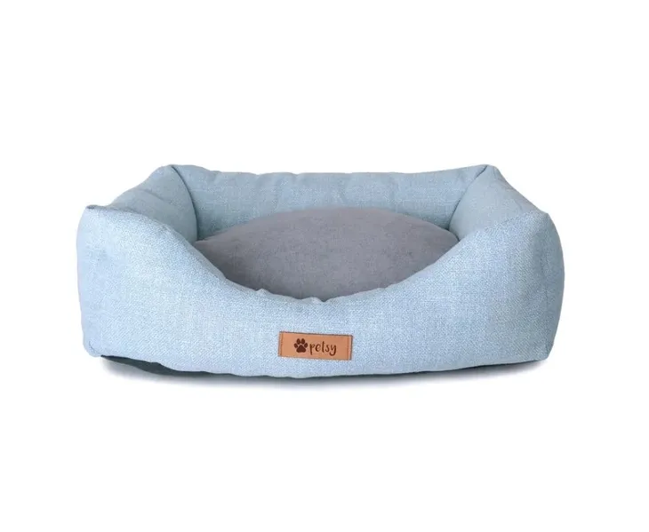 Luksusowe łóżeczko z wyjmowaną poduszką wewnętrzną. Łóżko wykonane z wytrzymałej i mocnej tkaniny w kolorze beżowym. Odpinana dwustronna poduszka zapinana na zamek. Z jednej strony niebieska tkanina, z drugiej delikatniejsza szara tkanina. Można prać ręcznie lub w pralce na delikatnym programie, maksymalnie 30°C. Nie czyścić chemicznie, nie suszyć w suszarce bębnowej. Antypoślizgowe dno i wypełnienie z pustych włókien.
