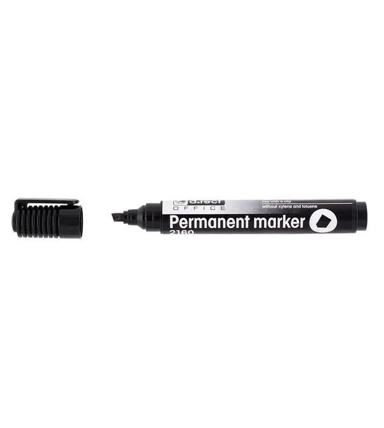 - permanentny marker z wodoodpornym, nietoksycznym, szybkoschnącym tuszem- plastikowa obudowa- skuwka z krótkim klipsem- nie zawiera ksylenu ani toluenu- końcówka ścięta - 1-5 mm- czarny-12 sztuk w opakowaniu zbiorczym