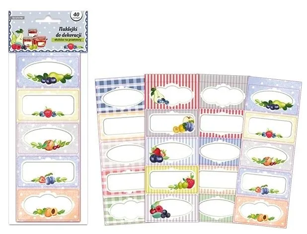 Zestaw zawiera 40 prostokątnych naklejek/etykiet do dekoracji słoików na przetwory. Na każdej naklejce miejsce na wpisanie nazwy.