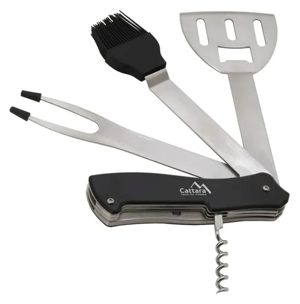 Narzędzie do grillowania 5w1 to praktyczny pomocnik podczas grillowania. Rękojeść wyposażona jest w czarną wyściółkę w części chwytnej dla wygodniejszego chwytu. Rękojeść można łatwo podzielić na dwa narzędzia. Narzędzie wyposażone jest w tokarkę, otwieracz do korkociągów, zatyczkę do butelek, widelec i kręgielnię. Może być używany w obozie, w obozie, gdzie indziej na wsi, ale także w domu na grilla.