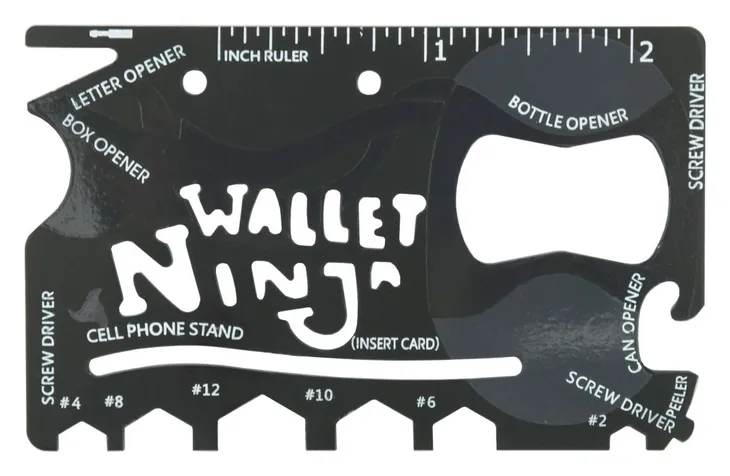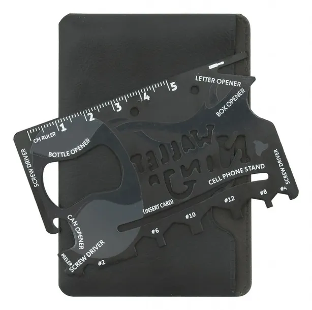 Wielofunkcyjne outdoorowe narzędzie survivalowe, zapewniające 9 funkcji przydatnych w różnych sytuacjach. Jest to niewielkie narzędzie o wymiarach 85 x 53 mm wykonane z wysokiej jakości stali nierdzewnej o grubości 1,1 mm. Narzędzie wyposażone jest w otwieracz do puszek i butelek, śrubokręt, skalę milimetrową, skalę calową, klucz do 6 najpopularniejszych rozmiarów, otwieracz do listów, otwieracz do pudełek i wreszcie stojak na mobil, można utworzyć za pomocą karty.