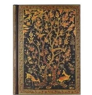 Projekt okładki tego eleganckiego notatnika odtwarza XVI-wieczne oprawienie mistycznej perskiej poezji, w której malowano lakierem ze złotym i perłowym pyłem. Kwitnące drzewa i jelenie wyróżniają się na matowym czarnym tle. Liście i drzewa obrysowane są złotą folią. Tłoczenie dodaje detale wymiarowe. Wzmocniony folią grzbiet pasuje do poszycia. Wewnątrz 160 lekko wyłożonych stron do pisania zapewnia mnóstwo miejsca do pisania osobistych refleksji lub zapisywania ulubionych cytatów lub wierszy. Bezkwasowy papier o jakości archiwalnej doskonale nadaje się do pisania długopisem. Uzupełniające złote nakładki wewnętrzne. Pozłacane obrzeże strony i elegancka wstążka dopełniają ten efektowny pakiet. Dziennik w twardej oprawie mierzy 6-1 / 4 '' szerokości x 8-1 / 4 '' wysokości.