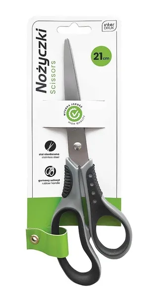 Poręczne nożyczki o długości 21 cm. Precyzyjne ostrze wykonane ze stali nierdzewnej. Gumowy uchwyt o ergonomicznym kształcie zapewnia komfort użytkowania.