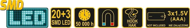 Przenośna latarka z diodami SMD o dużej mocy i małej mocy. Zapewnia dwa tryby świecenia - stałe białe światło i stały biały reflektor. Latarkę można łatwo zamontować za pomocą wbudowanego magnesu w uchylnym uchwycie lub zawiesić na wbudowanym haku.