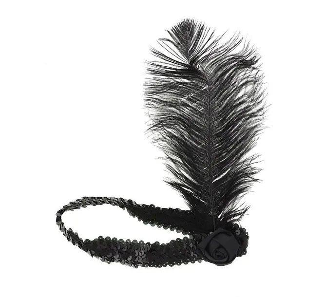 Opaska z piórem RETRO (czarna) Opaska retro zdobiona czarnymi cekinami na rozciągliwej gumce, idealnie dopasuje się do każdej głowy. Dodatkowym atutem jest pióro czarne pióro. Pod piórkiem znajduje się materiałowa róża.