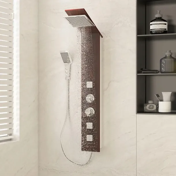 Panel prysznicowy wykonany jest z wysokiej jakości szkła z pięknym nadrukiem na wzór drewna. Ma trzy funkcje: deszczownicę, dysze do masażu i ręczną głowicę natryskową, które można łatwo wybrać za pomocą pokrętła.