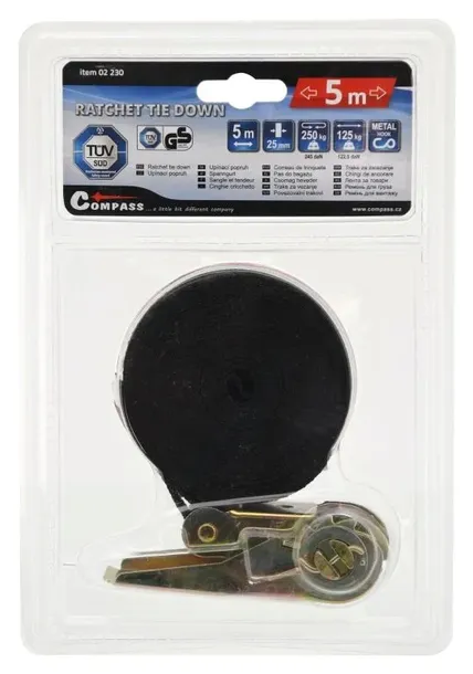 Grzechotka to całkowicie metalowa konstrukcja z mechanizmem zabezpieczającym i paskiem o szerokości 25 mm i długości 5 m, przymocowanym bezpośrednio do zapadki zaciskowej. Taśma ma wytrzymałość na rozciąganie 250 kg (po okrążeniu ładunku). Do mocowania ładunku zalecamy stosowanie plastikowych narożników lub tulei ochronnych. Bez użycia ochronnych rękawów lub narożników wytrzymałość pasów jest zmniejszona i pasek jest noszony.
