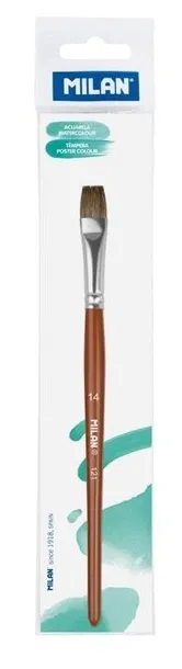 Szkolny płaski pędzel serii 121 nr 14 z krótkim drewnianym trzonkiem. Skład: 70% naturalnego włosia koziego + 30% syntetyczne. Brązowe lakierowane wykończenie i aluminiowa skuwka bez spawania, odporna na rdzewienie. Bardzo miękkie włosie idealne do technik akwarelowych, wodnych i plakatowych. Lepsze zatrzymanie wody i farby. Gładsza linia. Lepsza odporność i elastyczność, co ułatwia odzyskanie kształtu po jego użyciu. Szerokość włosia: 11,5 mm. Grubość włosia: 4 mm. Długość włosia: 14 mm. Długość pędzla: 195 mm.