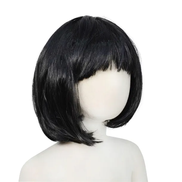 Peruka wykonana z włosów syntetycznych w kolorze czarnym. Fryzura w stylu cięcia bob z grzywką. Dopełnienie stylizacji, przebrania na bal karnawałowy, sylwestrowy, halloween. Długość włosów to około 25 cm. Peruka w rozmiarze uniwersalnym.