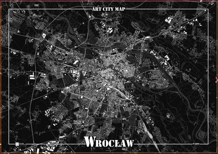 Czarno-biały plakat dekoracyjny, prezentujący siatkę urbanistyczną Wrocławia. Plakat w formacie A1, pakowany w tubę kartonową o wym. 52/650 mm.