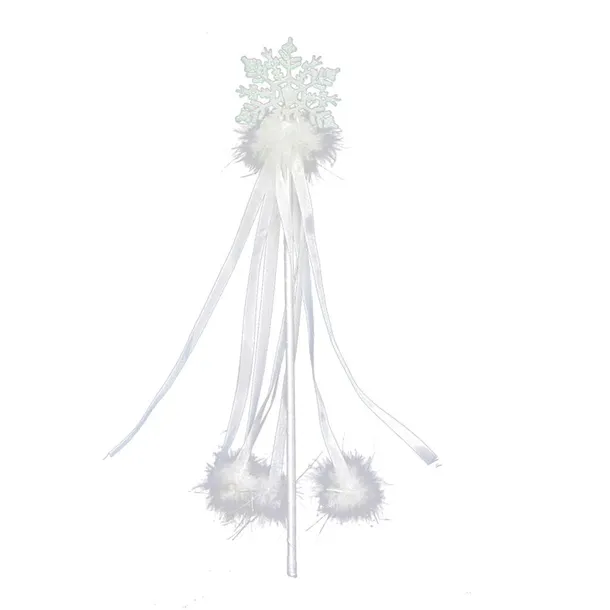 Różdżka ze śnieżynką i wstążeczkami z pomponikami. Idealny dodatek do stroju śnieżynki. Długość: 42 cm. Kolor: biały