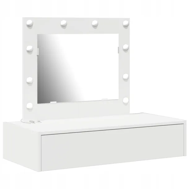 Ta ścienna toaletka wnosi nowoczesny styl i przydatne funkcje dzięki wbudowanym LED-om, które usprawniają dbanie o urodę. Z eleganckim białym wykończeniem i prostymi liniami, to nie tylko ładny mebel, ale też super funkcjonalne rozwiązanie do codziennej pielęgnacji.