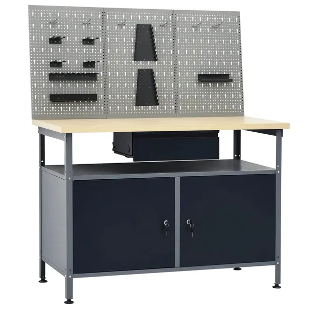 Stół warsztatowy wyróżnia się sporą przestrzenią do przechowywania i maksymalną nośnością wynoszącą 300 kg. Ma on otwartą przegrodę z szufladą, pozwalając na uporządkowanie Twoich narzędzi, części i akcesoriów, takich jak śruby, gwoździe i taśmy klejące. Zawiera on także 2 półki i duże miejsce na większe narzędzia z 2 zamykanych drzwiczek, aby z łatwością schować wiertarki, bębny z kablami i szlifierki. Ponadto nóżki stołu mają regulację wysokości. Ten mebel roboczy wykonano z najwyższej jakości stali i płyty wiórowej, zapewniając wyjątkową wytrzymałość, trwałość i łatwość czyszczenia. Montaż jest prosty.