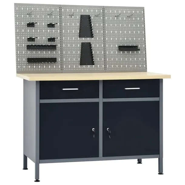 Zestaw ten łączy 1 stół roboczy i 3 panele ścienne, stanowiąc praktyczne rozwiązanie kwestii przechowywania w warsztacie lub garażu.