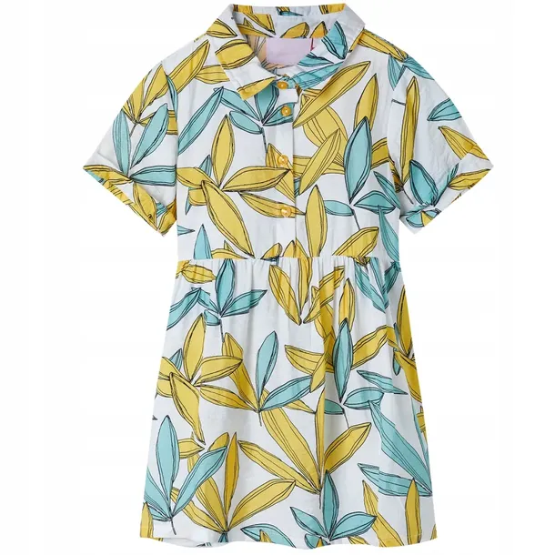 Ta dziecięca sukienka ma krótkie rękawy, wywijany kołnierzyk i zapięcie na guziki z przodu. Jest ozdobiona nadrukiem kwiatów na całej powierzchni. Została wykonana z miękkiego materiału zawierającego 80% rayonu i 20% nylonu dla wygody i przewiewności.