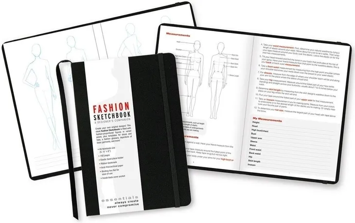 Szkicownik pomagający projektantom tworzyć własne kreacje zawierający kilka stron z informacjami o projektowaniu ubiorów. W środku znajdują się szkice sylwetek kobiecych z każdej strony tak by można było zaprojektować ubiór ze szczegółowymi elementami. Na samym końcu znajduje się dział przeznaczony projektom dodatków do ubrań takich jak kapelusze oraz buty. Czarna twarda okładka nie rozprasza twórczych myśli. Produkt posiada czarną wstążke jako zakładkę, elastyczną gumkę i kopertę z tyłu na drobne notatki i papiery. 192 strony