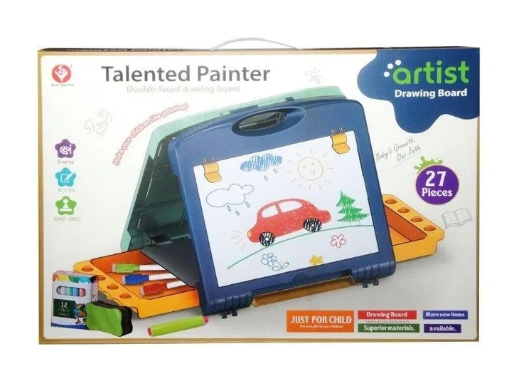 Zabawkowa tablica zarówno do pisania, rysowania, a także do wykonywania zadań matematycznych i układania słów. W zestawie dwustronna tablica, po której z jednej strony można rysować, a z drugiej strony posiada grę. Ponadto w zestawie załączono kolorowe kredy.
