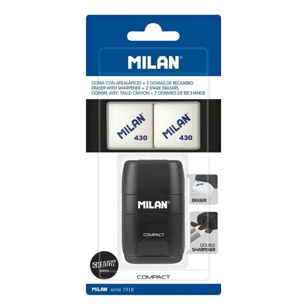 Fantazyjne połączenie gumki i temperówki w jednym. Z jednej strony podwójna temperówka na cienkie i grube kredki i ołówki. Z drugiej miękka gumka z syntetycznego kauczuku, a po środku pojemnik na ścinki. Specjalna kolekcja Shadow, w kolorze czarnym. Ma ostre i wytrzymałe ostrza ze stali węglowej dzięki czemu idealnie nadaje się do wszystkich rodzajów ołówków. Posiada system bezpiecznych ostrzy, który zapobiega odłączeniu się ostrza od korpusu temperówki. Idealna do użytku szkolnego. Oryginalny produkt stworzony przez własny dział badawczo-rozwojowy MILAN. Zawiera 2 dodatkowe zapasowe gumki. Gumki MILAN są produkowane w Hiszpanii od 1918 roku.