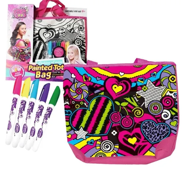 Zestaw zawiera torebkę, markery i wiele pomysłów na projektowanie. Aby dowiedzieć się jak kolory będą wyglądać na torebce, najlepiej wypróbować je najpierw na innym materiale.