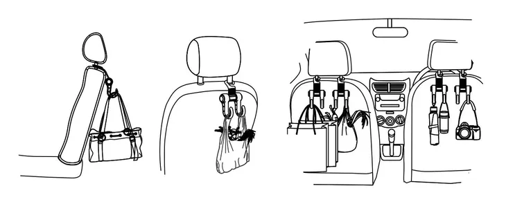 Praktyczny uchwyt do zawieszenia na zagłówku przednich siedzeń samochodu. Wyposażony jest w dwa haczyki, na których można zawiesić np. torbę na zakupy, ubrania, plecak itp. Posiada solidną konstrukcję nadwozia.