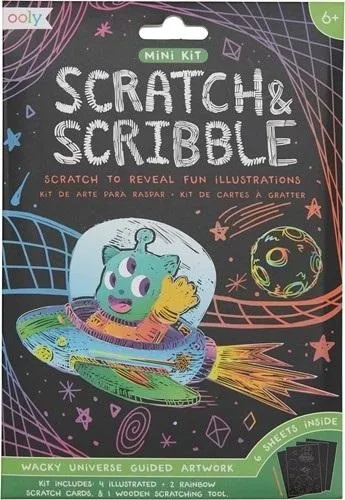 Rozpocznij wesołą zabawę z tym mini zestawem do zdrapywania. W zestawie znajdziesz drewniany rysik, cztery urocze ilustracje kosmitów i dwie puste zdrapki do stworzenia własnego kolorowego obrazka. Drapu, drapu prosto do odległych wszechświatów!