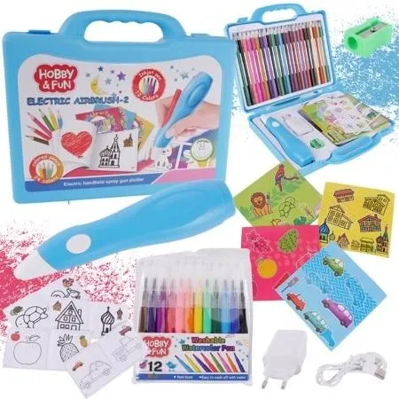 Aerograf elektryczny to fantastyczne narzędzie, które pozwala dzieciom na malowanie w nowy i innowacyjny sposób. Należy wybrać pisak w wybranym kolorze, wsunąć go do urządzenia, a następnie przycisnąć guzik na aerografie, aby rozpylić dany kolor na powierzchni. Dzięki temu dzieci mogą tworzyć efektowne i kreatywne obrazy za pomocą aerografu. Dodatkowo, aerograf posiada możliwość podłączenia za pomocą USB, co umożliwia ładowanie i korzystanie z niego na dłużej.