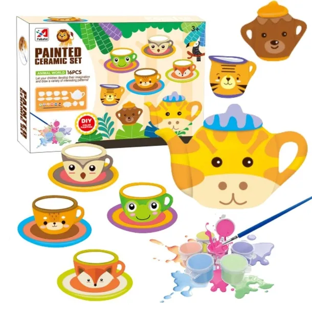 Zestaw składa się z 4 filiżanek, 4 talerzyków, dzbanka, dzbanuszka na śmietankę, cukierniczki, farbek, paletę pod farby i pędzla. Mogą malować każdy element zestawu w inny sposób, tworząc niepowtarzalne wzory i kolory.