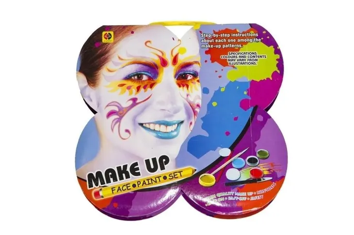 Zestaw do malowania twarzy, który zawiera: instrukcję, 2 pędzelki, 2 kredki, 6 kolorów farb, 2 gąbki, lusterko. Produkt nie potrzebuje baterii. Zabawka przeznaczona dla dzieci powyżej 3 roku życia.