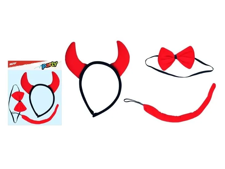 Maska dziecięca diabełek . Opakowanie zawiera opaskę z uszami, muszkę na gumce oraz ogon na gumce.